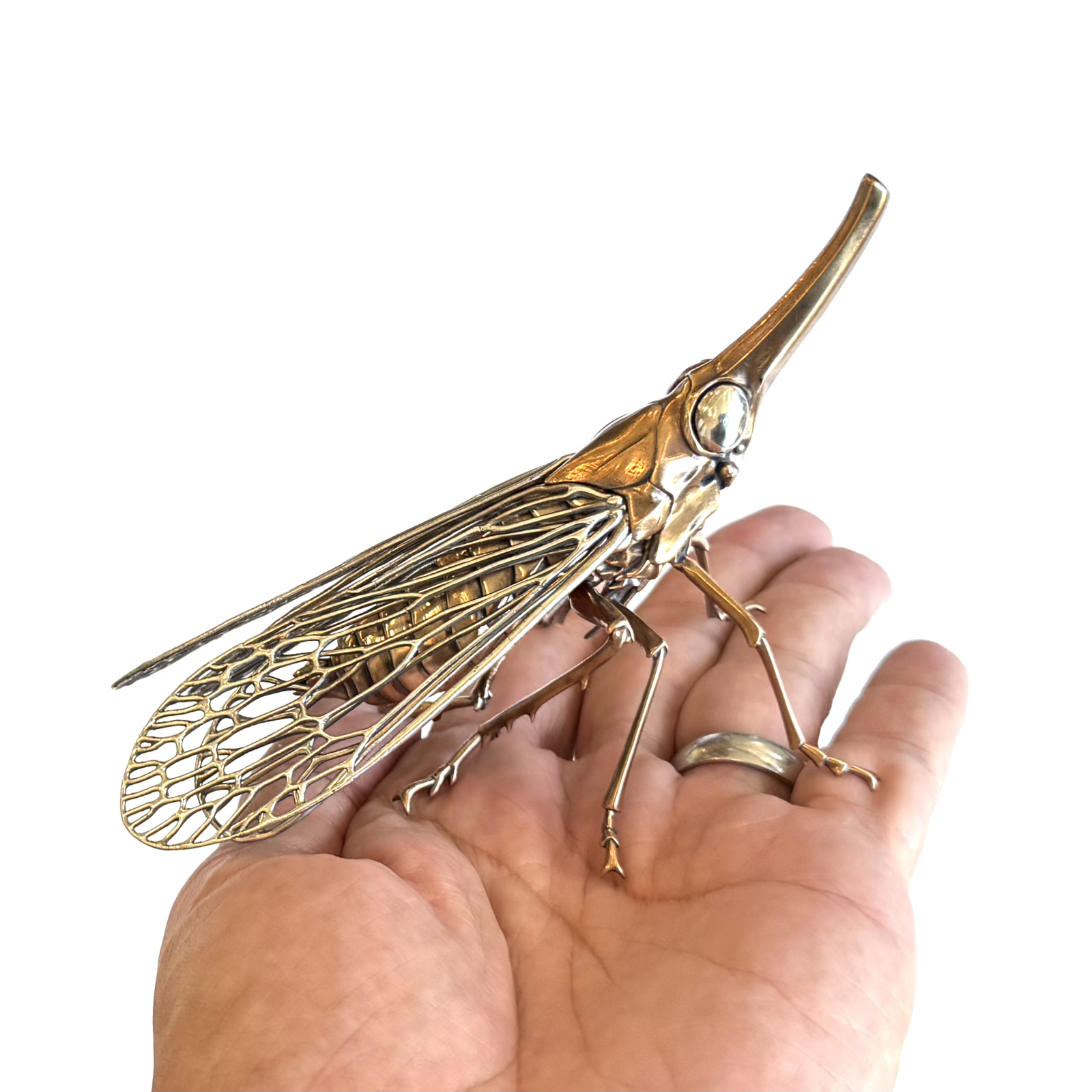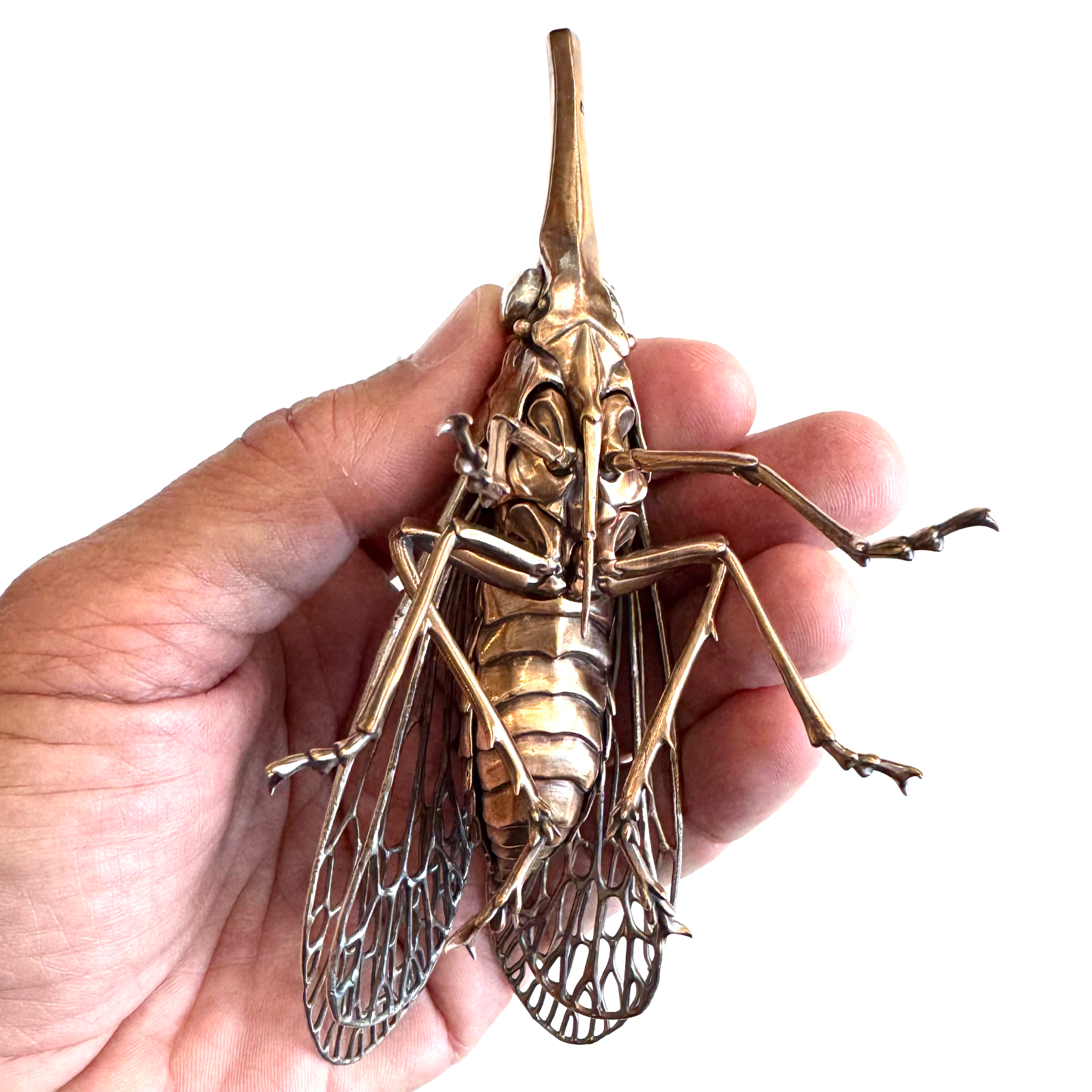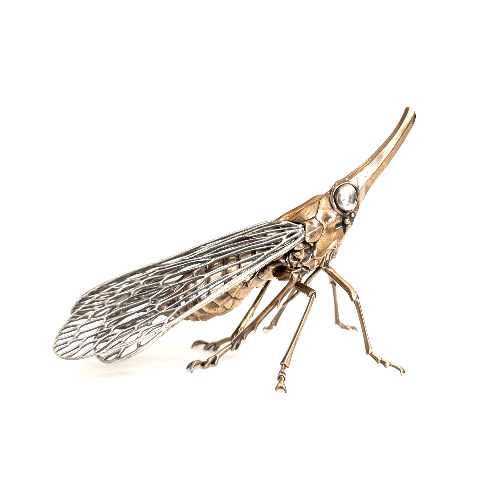 Cast bronze body parts and 925 sterling silver eyes and wings, assembled with nuts and bolts.