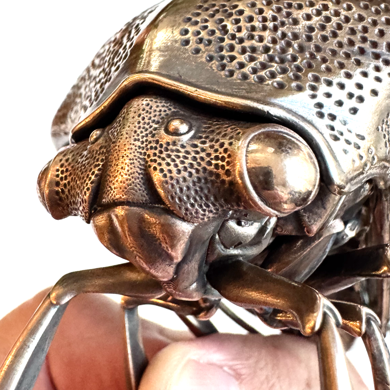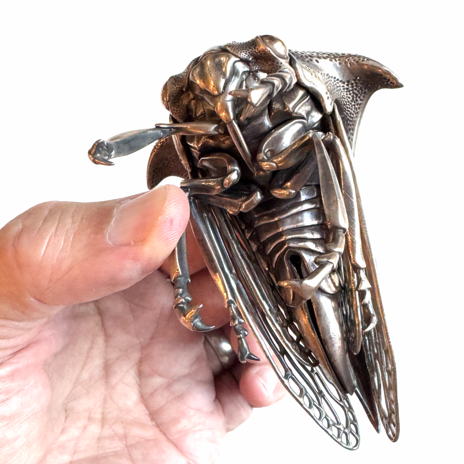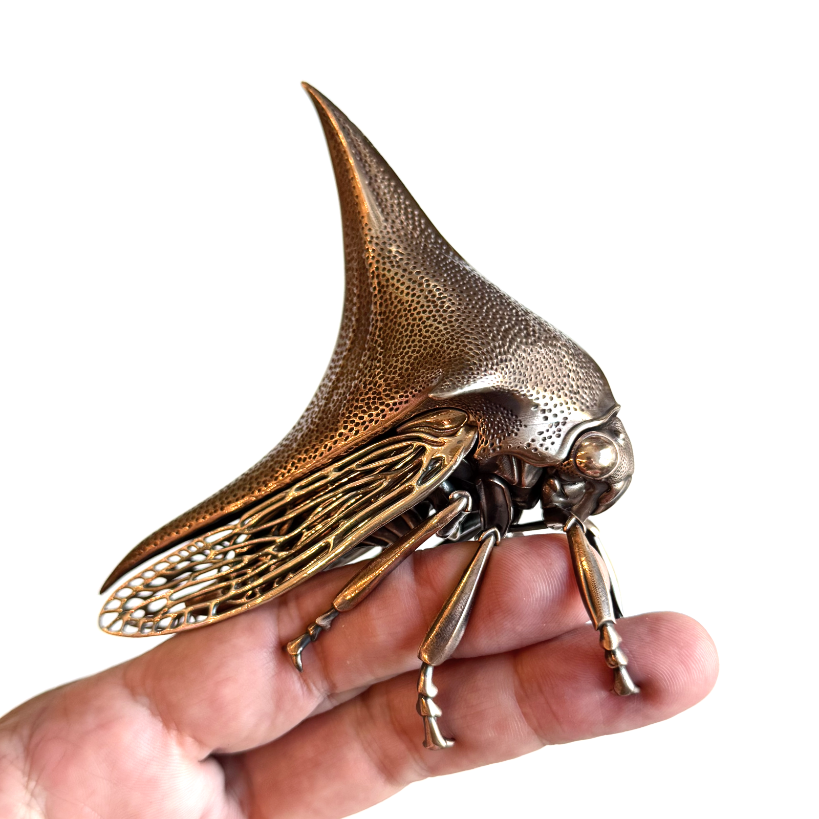 First edition: Seven cast pieces (three bronze, four silver). Second edition: Eleven pieces of cast metal (seven bronze pieces, four 925 sterling silver wings) assembled with nuts and bolts.