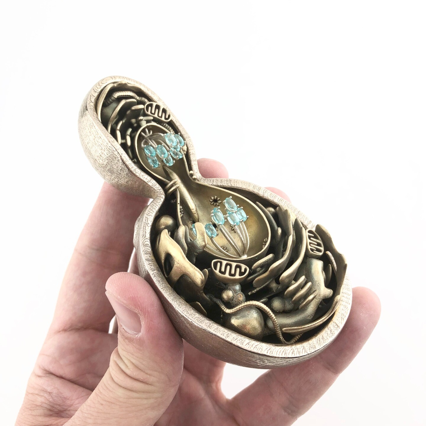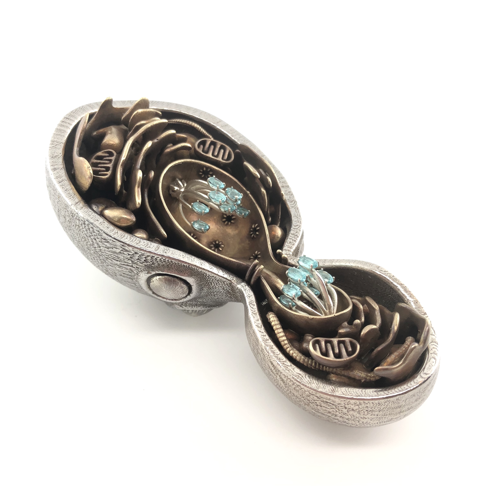 Cell division. This is a cell of budding yeast, Saccharomyces cerevisiae, the microorganism that helps us make bread, beer, and wine. Budding yeast cells divide asymmetrically, with the larger mother cell forming a smaller bud which then grows and separates. Here I have captured the cells in late anaphase, just before completion of division. The outer cell walls are 3D printed steel infiltrated with bronze; the organelles are bronze, and the mitotic spindles separating inside the nucleus are sterling silver. Apatite gemstones represent the chromosomes, chosen because they get their blue-green color from phosphorus, the element that forms the backbone of DNA, from which the chromosomes are made.